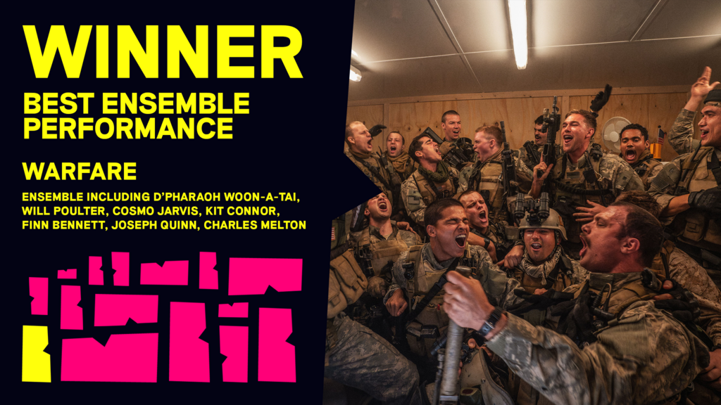 And… we have our first winner! We’re delighted to share that Warfare, Alex Garland’s visceral boots-on-the-ground Navy SEAL drama, has won the Best Ensemble award, for the efforts of its cast including D’Pharoah Woon-A- Tai, Will Poulter, Cosmo Jarvis, Kit Connor, Finn Bennett, Joseph Quinn and Charles Melton.